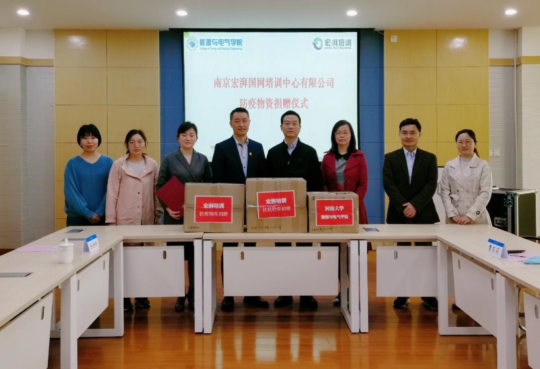 4月29日,宏湃国网培训中心向河海大学能源与电气学院捐赠防疫物资仪式在勤学楼5208会议室举行。宏湃国网培训中心总经理何广会、宏湃国网培训中心王略、河海大学能源与电气学院党委书记娄健、河海大学能源与电气学院党委副书记张炜、河海大学校医院杨静静、河海大学能源与电气学院电力系副系主任史林军、河海大学能源与电气学院团委书记雷镕甄、河海大学能源与电气学院办公室主任曹东莉参加捐赠仪式。