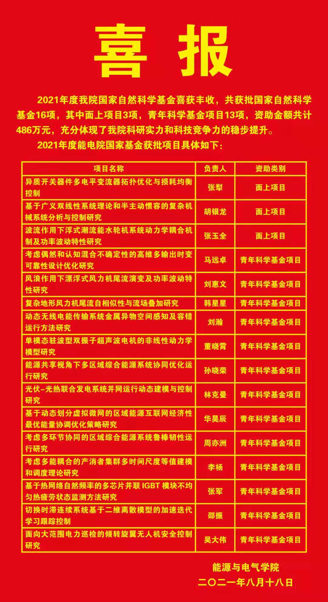 喜报-2021年度棋牌 国家自然科学基金喜获丰收