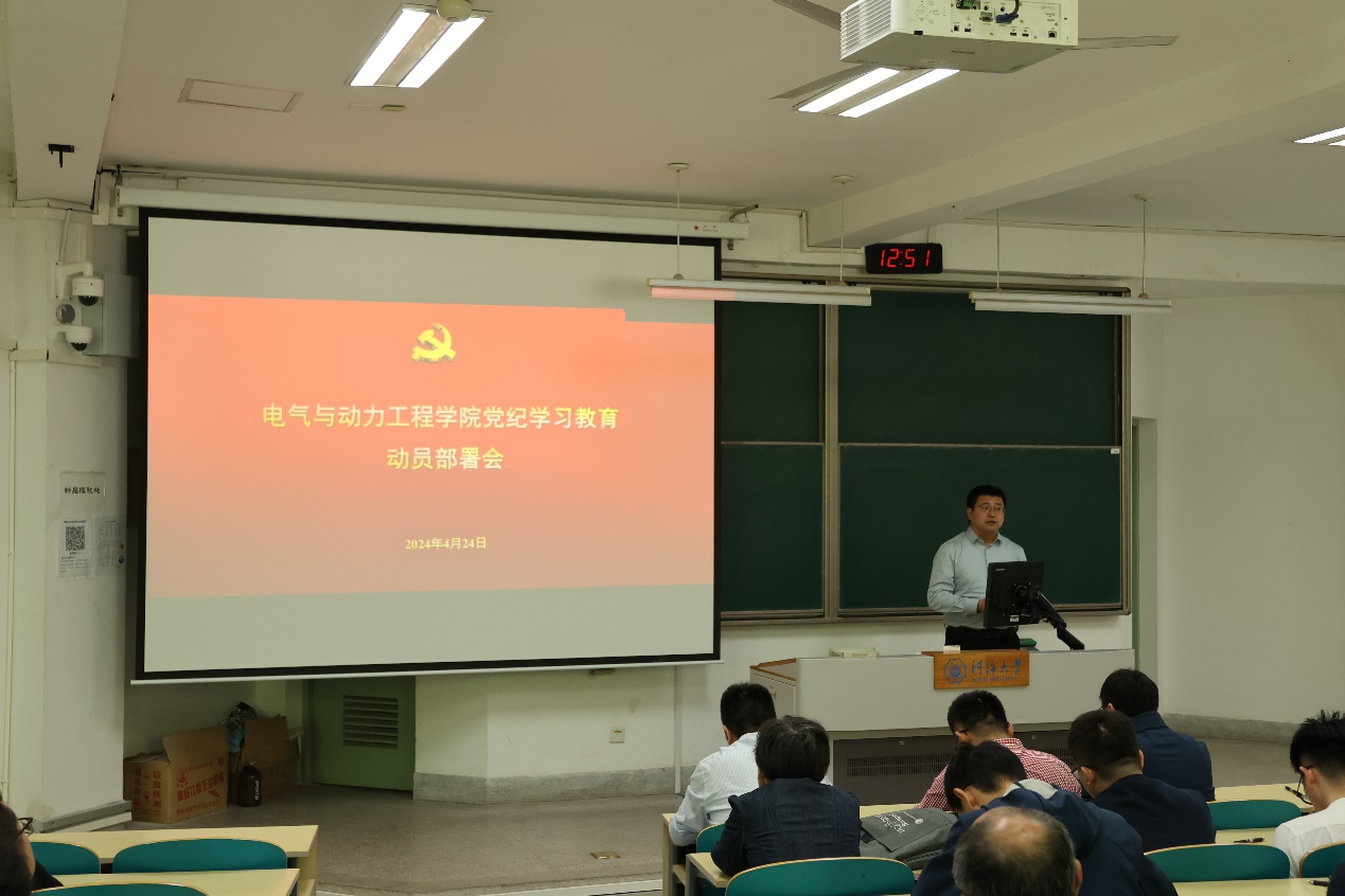 学院党委书记吴洪彪首先做了党纪学习教育动员。开展党纪学习教育,是以习近平同志为核心的党中央作出的重大决策部署,是加强党的纪律建设、推动全面从严治党向纵深发展的重要举措。一要提高政治站位,引导学院干部师生深刻认识党纪学习教育的重大意义。二要明确目标要求,搞清楚党的纪律规矩是什么,弄明白能干什么,不能干什么,把遵规守纪刻印在心、内化为日用而不觉的言行准则。三要压实主体责任,成立学院党纪学习教育工作组,既坚持“规定动作”,又做好“自选动作”,自2024年4月至7月,通过4个月的时间,切实把党纪学习教育成效转化为学院高质量发展成果。