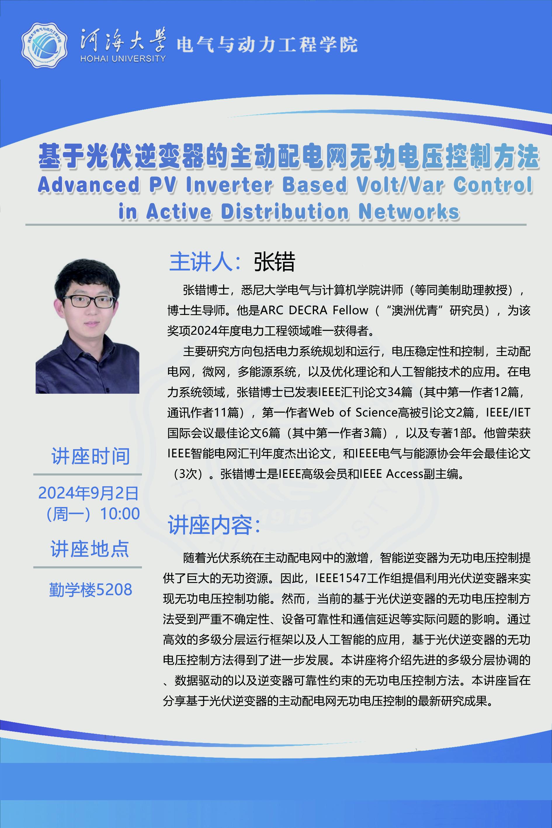 学术报告:基于光伏逆变器的主动配电网无功电压控制方法