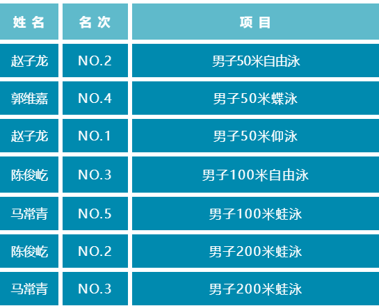 本次比赛分为男子组和女子组,共有50米蝶泳、50米仰泳、50米蛙泳、50米自由泳、100米自由泳、100米蛙泳、200米自由泳、200米蛙泳八种项目。棋牌 共有8名学生参赛,经过激烈角逐,获得男子50米仰泳第1名、男子50米自由泳第2名、男子200米蛙泳第2名、男子200米蛙泳第3名、男子100米自由泳第3名等成绩,展现了电气学子的拼搏精神和昂扬锐气。