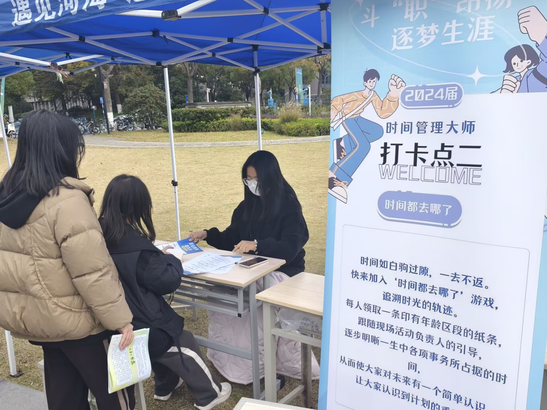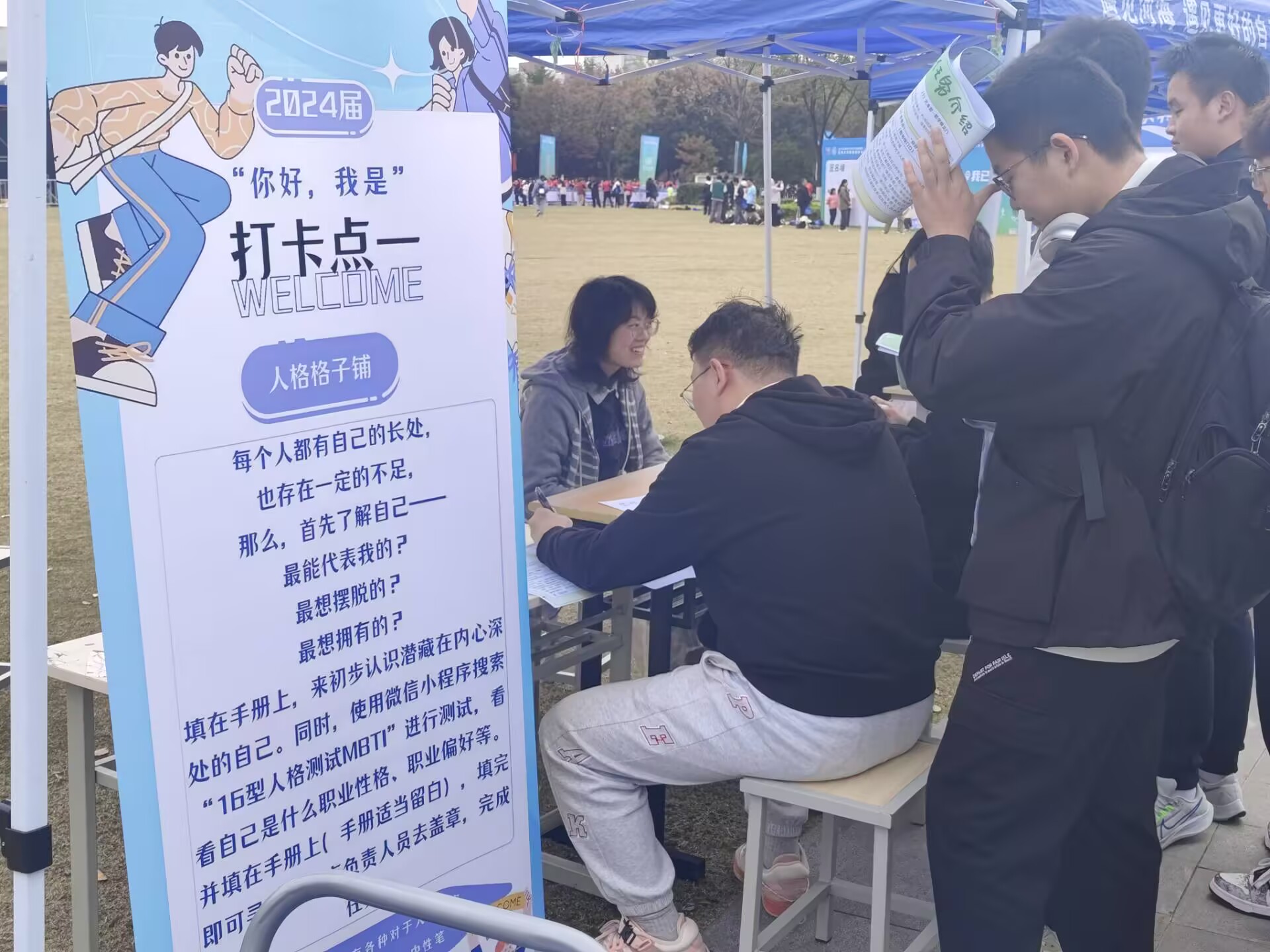 生涯探索板块以游戏闯关的方式进行,鼓励同学们在活动中认知真实自我,在游戏中感受职业生涯。活动分为“你好我是”“时间管理大师”和“我要的未来”三个主题任务、涵盖“人格格子铺”“时间都去哪了”“职业猜猜猜”“擘画未来”4组游戏内容,活动参与者领取生涯规划探索手册后,于各任务点完成活动任务并集章打卡。