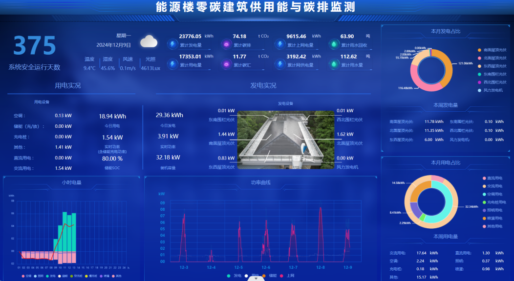 本项目创新突破并集成应用了被动式节能+风光储建筑/景观一体化、风光储直柔+源网荷储多能互补的零碳建筑微电网(光储充用直流微电网、风光热储用交流微电网、交直流柔性互联微电网)、零碳建筑电/热/冷供用能全过程电碳协同(实时动态碳排计算)、基于用能互联网的互动交易等关键技术,研制建筑微电网能源网关、建筑能耗与碳排放管控平台,在河海大学西康路校区进行既有建筑绿色低碳智慧用能改造,本体节能率75%,综合节能率135%,实现负碳运行,是首个智慧用能与建筑节能相结合的零碳建筑。