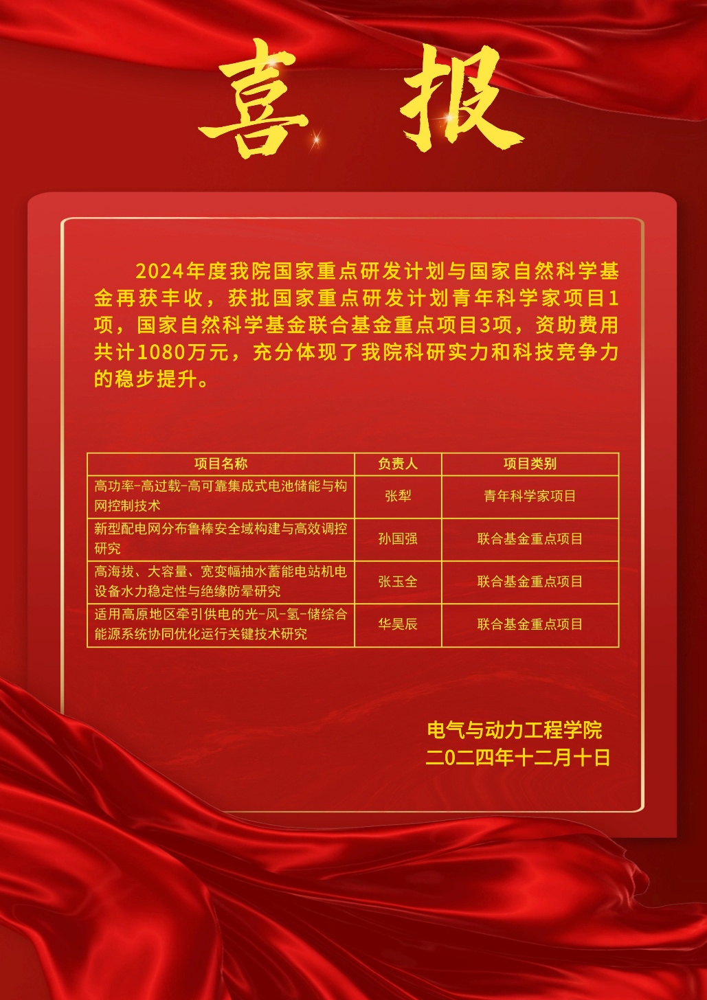 2024年度棋牌 国家重点研发计划与国家自然科学基金再获丰收,获批国家重点研发计划青年科学家项目1项,国家自然科学基金联合基金重点项目3项,资助费用共计1080万元,充分体现了棋牌 科研实力和科技竞争力的稳步提升。