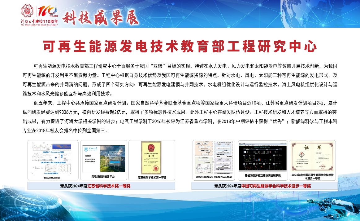 近五年来,工程中心共承接国家重点研发计划、国家自然科学基金联合基金重点项等国家级重大科研项目近10项、江苏省重点研发计划项目2项,累计纵向研发经费达到9336万元,横向研发经费超2亿元,取得了多项标志性技术成果。此外工程中心在研发队伍建设、工程技术研发和人才培养等方面取得的突出成果,有力促进了河海大学相关学科的进步;电气工程学科于2016年被评为江苏省重点学科,在2018年中期评估中获得“优秀”:新能源科学与工程本科专业在2018年校友会排名中位列全国第三。