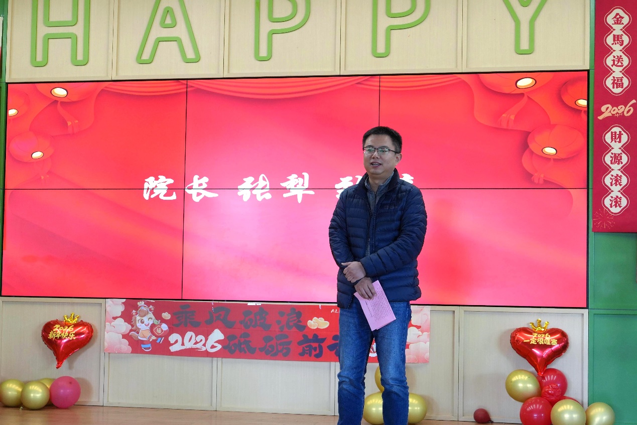 联欢会在热烈的掌声中拉开帷幕。学院院长张犁发表致辞,向全体教职工致以最诚挚的新春问候和最美好的节日祝愿。他全面回顾了学院过去一年在教学科研、人才培养、学科建设等领域取得的丰硕成果,每一项成绩的背后都凝聚着全体教职工的辛勤耕耘与无私奉献。张犁院长对大家一年来的坚守与付出表示衷心感谢,并勉励全体同仁在新的一年里,继续保持昂扬向上的精神状态,立足本职、锐意进取,以实干担当推动学院各项事业稳步前行、再创佳绩。