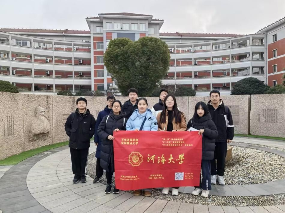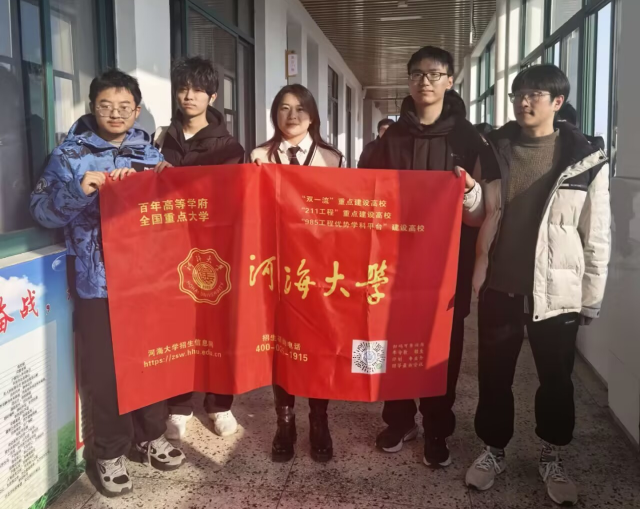 2月11日,河海大学“江海溯源”南通中学宣讲团返回母校江苏省南通中学,开展摆摊宣传与进班宣讲联合活动。团队由来自电气、机电、经济、里尔等学院的学子跨院组建,前期认真参加培训、对接招生组。队员们首先拜访恩师,汇报大学成长;随后在集中宣讲教室设立咨询摊位,通过队旗、文创与资料吸引大批学弟学妹驻足交流。