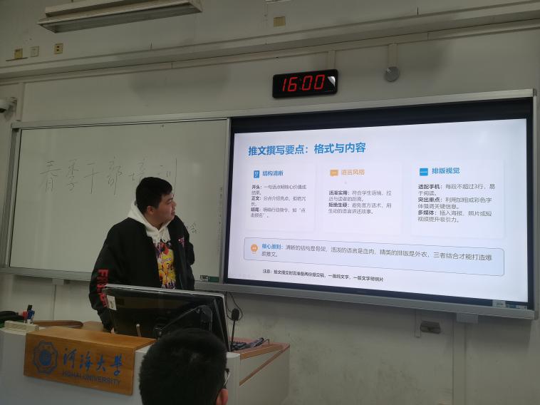 本次分享会聚焦推文写作与手机摄影两大核心技能,内容贴合学生工作实际需求,实用性满满。活动伊始,季子澄同学率先带来推文写作技巧分享,从推文的核心定义与特点出发,系统拆解活动预告、活动回顾、动员号召三类常用推文的写作逻辑与创作要点。他着重讲解了推文“开头点题、正文分点、结尾明指令”的结构搭建技巧,结合学生工作案例,分析了排版视觉、语言风格的优化方法,同时针对内容空洞、逻辑混乱、AI使用不当等常见问题,给出具体避坑解决方案,让大家清晰掌握打造优质活动推文的关键要点。