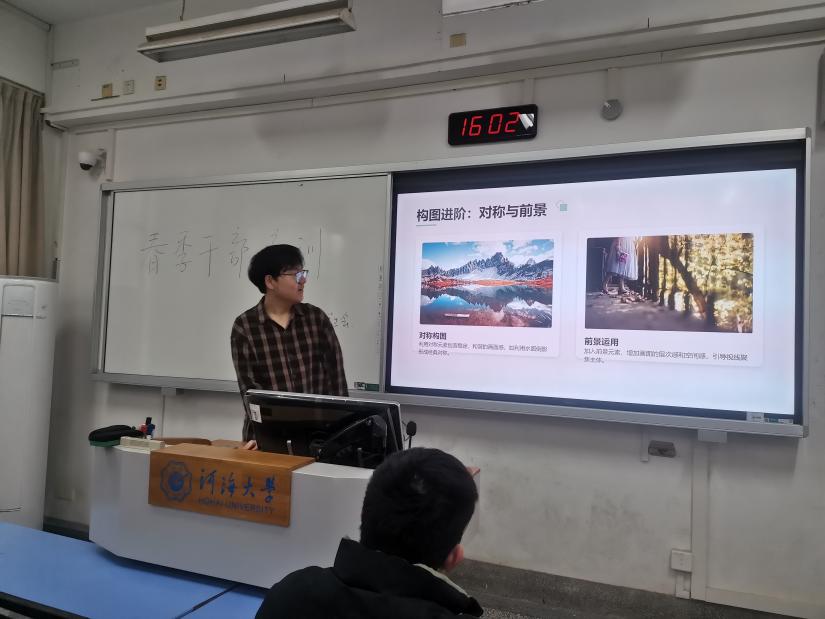 随后,李响同学带来手机摄影技巧干货分享,从摄影基础到实操技巧,层层递进讲解手机摄影的实用方法。他以三分法、对称构图等基础构图技巧为切入点,延伸至引导线、框架构图等进阶玩法,结合校园拍摄场景,讲解黄金时刻、侧光、逆光等光影的运用技巧,还详细介绍了HDR、全景模式等手机摄影功能的正确使用方式。同时,针对主体居中、背景杂乱、画面倾斜等常见拍摄错误,给出规避方法,手把手教大家用手机拍出氛围感校园大片,让每一位参与者都能快速上手。