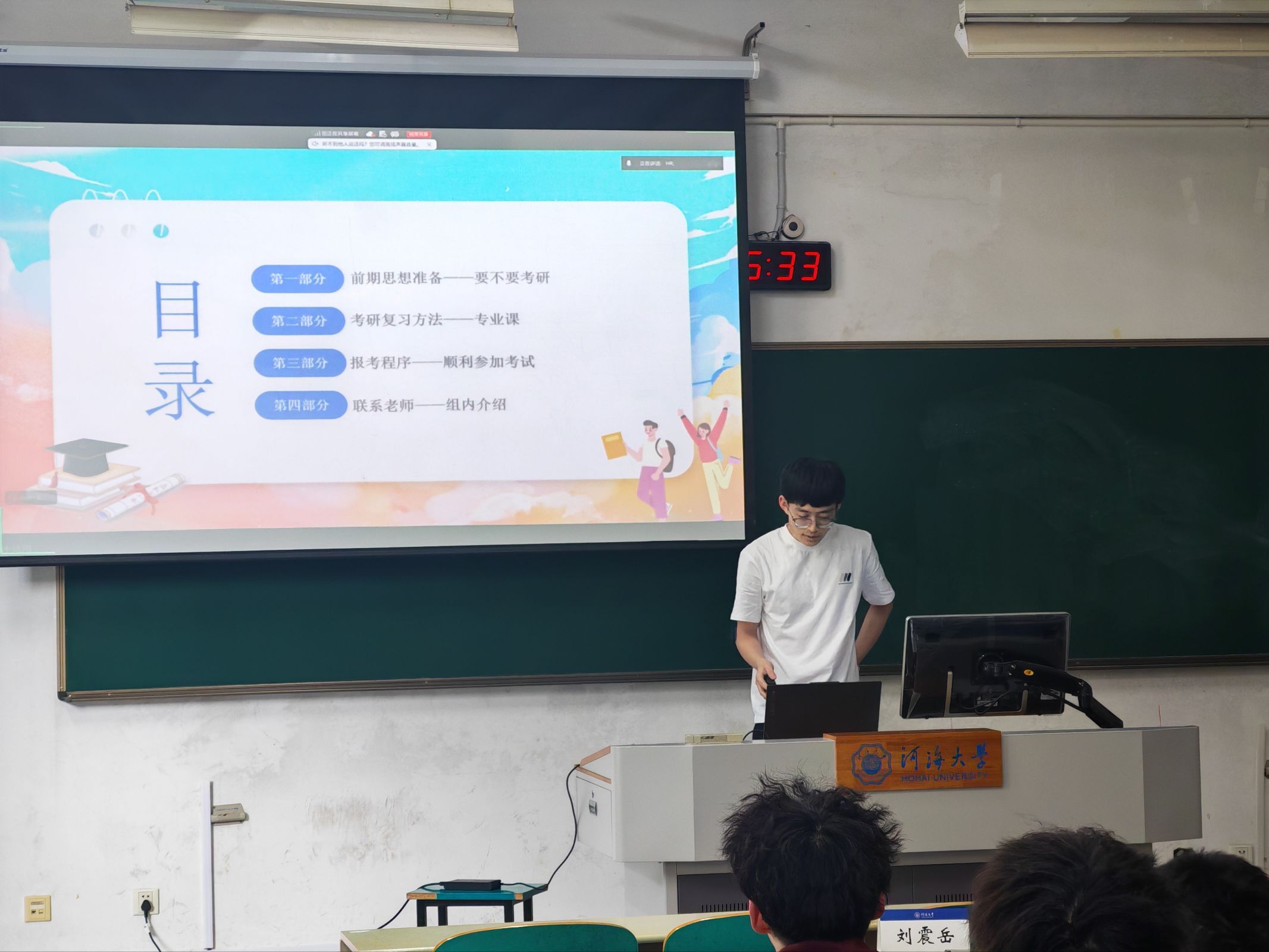 刘震岳同学则聚焦考研专业课与报考程序,带来极具实操性的建议。他提醒同学们“先确定院校,为目标努力”,避免盲目报考,同时关注官网动态以防专业课改考。在专业课备考上,他主张分阶段推进:前期梳理框架、暑期强化做题、秋季真题训练、考前全真模拟。他还详细介绍了报考程序中的关键节点,如预报名、正式报名、线上确认、准考证打印等,并鼓励有意报考河海大学的同学提前联系导师,做到“少鸽子、讲诚信”。